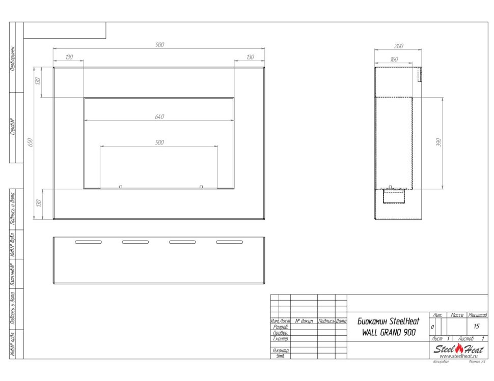 Биокамин SteelHeat WALL GRAND 900 черный, стемалит